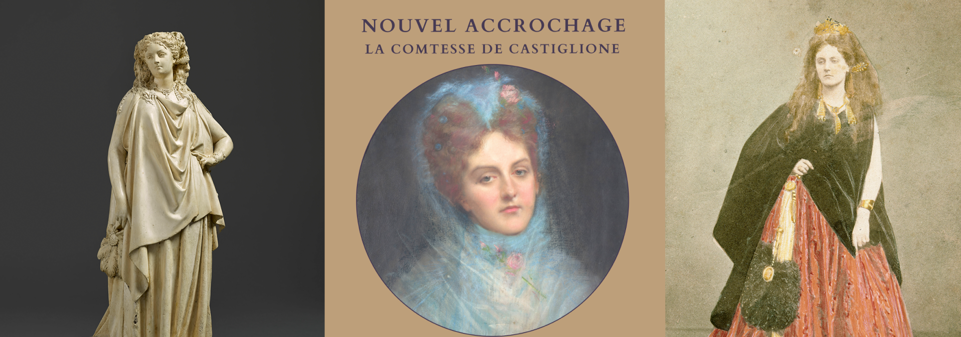 Les collections du musée du Second Empire se rapportant à la comtesse de Castiglione proviennent essentiellement de deux admirateurs tardifs, qui contribuèrent à établir sa réputation de belle extravagante. Le comte Robert de Montesquiou (1855-1921) réunit d’innombrables objets ayant appartenu à celle qu’il désigna comme La Divine comtesse, dans un livre consacré à une Etude d’après Madame de Castiglione, sans jamais vouloir la rencontrer. Un portrait ovale ainsi qu’un album de photographies lui ayant appartenu, récemment entrés dans les collections du château de Compiègne, motivent notre accrochage temporaire. D’autres photographies complètent cet ensemble, dont celle de la comtesse de Castiglione encapuchonnée dans son costume d’Ermite de Passy, qui avait tant contrarié ceux qui espéraient la voir nue.