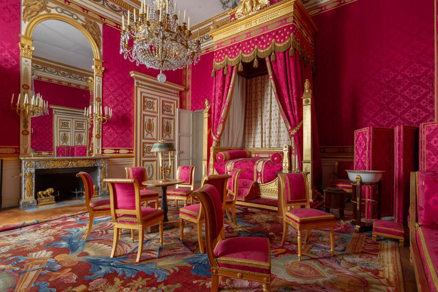 Lorsque l’empereur Napoléon décide en 1807 de redonner à Compiègne son statut de résidence, il commande à l’architecte Berthault une mise au goût du jour des décors mettant en exergue une nouvelle distribution des appartements. Afin de remeubler un château vidé à la Révolution, de grandes commandes sont passées auprès des menuisiers, ébénistes ou tapissiers souvent regroupés dans des manufactures depuis la suppression des corporations. La grande cohérence de ces ensembles mobiliers témoigne de la hiérarchie des salons entre eux mais aussi des innovations de cette période : nouveautés formelles (somno, pommier, psyché sont des créations de cette époque), lignes épurées, références à l’Antiquité mais aussi accords colorés audacieux font du château de Compiègne un jalon majeur de la connaissance du style Empire.